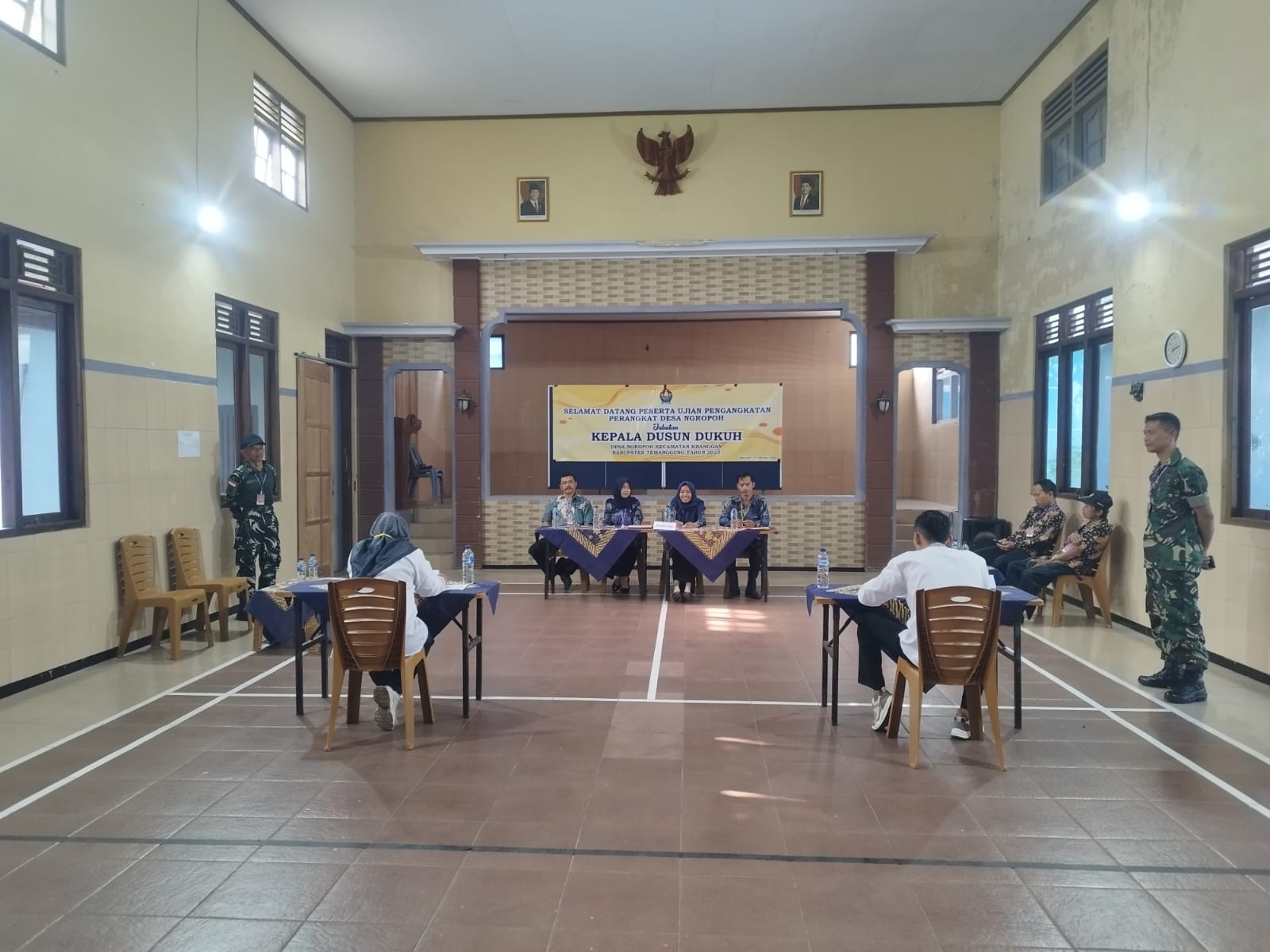 Pelaksanaan Tes pengisian perangkat desa ngropoh formasi kepala dusun dukuh yang dilaksanakan pada hari rabu 15 Oktober 2025 mulai pukul 08.00. dalam pelaksanaan tes ini diikuti dua orang calon perangkat desa atas nama Teguh Prastiyo dan Tri Murdaningsih. pelaksanaan tes meliputi tes tertulis dan tes ketrampilan komputer. dari tes tersebut diperoleh peserta yang lolos ujian menjadi perangkat desa atas nama Teguh Prastiyo.